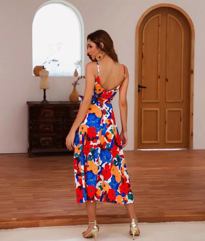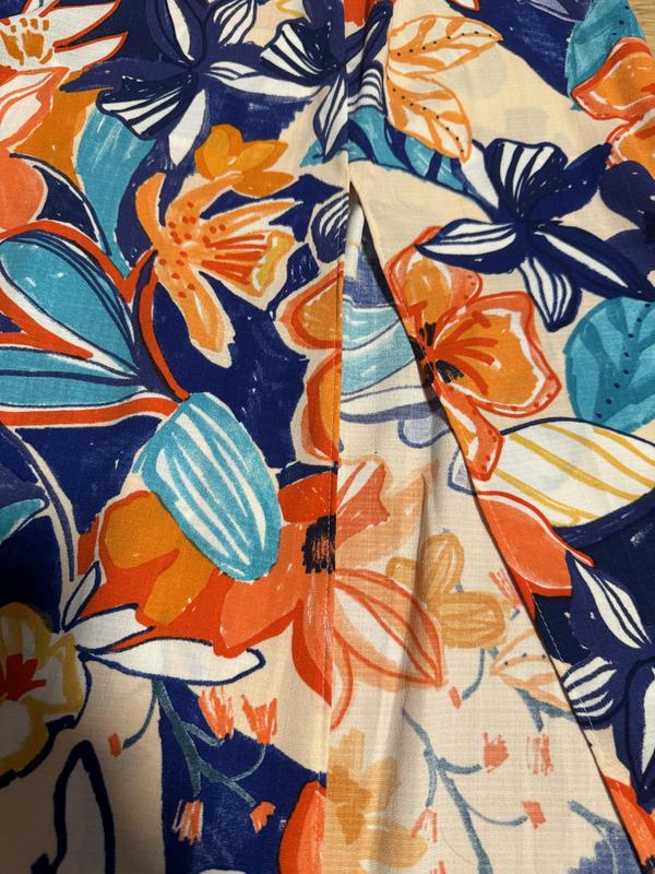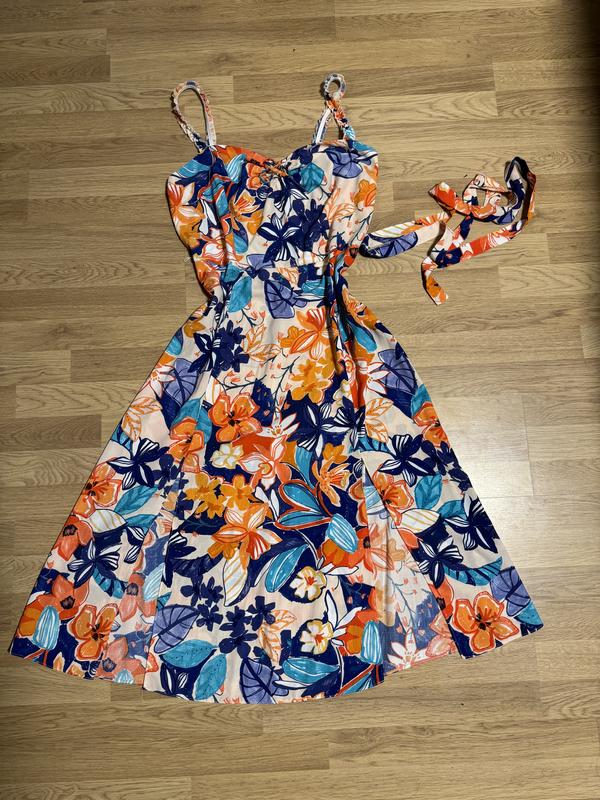 Красивый сарафан в цветочный принт. Отлично смотрится как с футболкой, так и без нее. Спереди внизу два разреза. Размер указан 16.