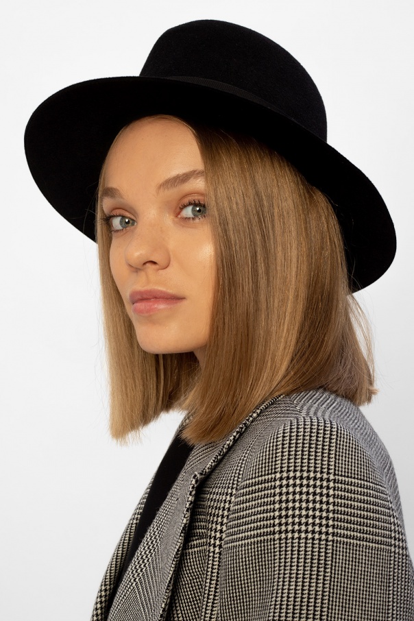 Black fedora hat from Saint Laurent. Crafted from rabbit felt, this item features a grosgrain ribbon with a logo detail in antiqued silver-tone.