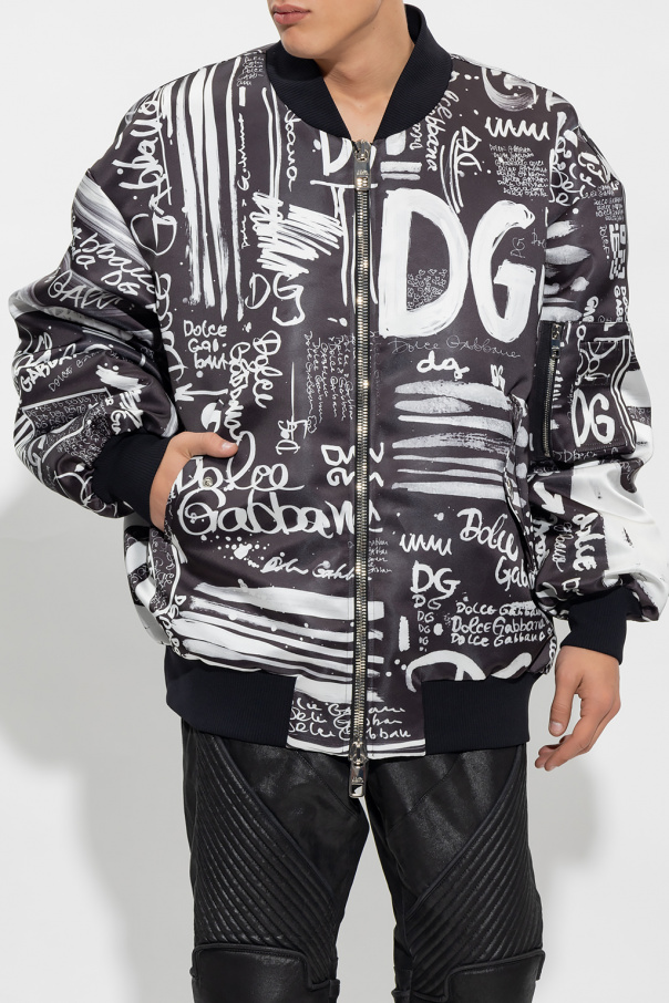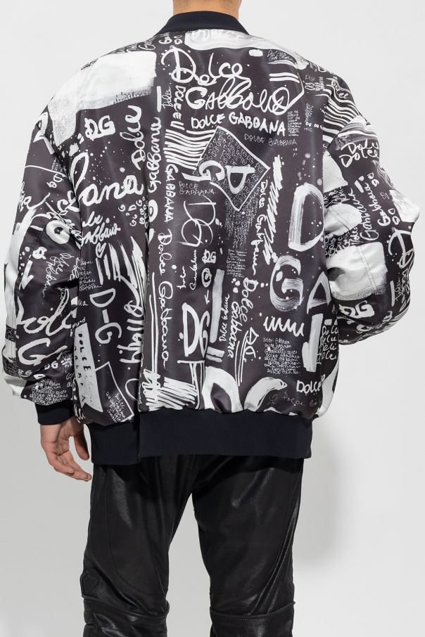 Black and white bomber jacket from Dolce & Gabbana. Fastened with a silver-tone two-way zip, this garment features white logo print, two snap-fastened pockets, long sleeves and black ribbed trims.