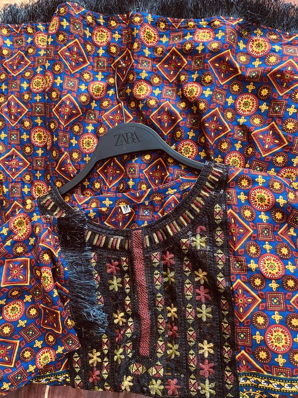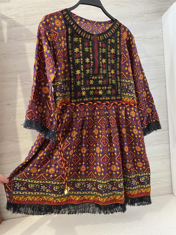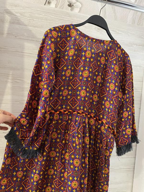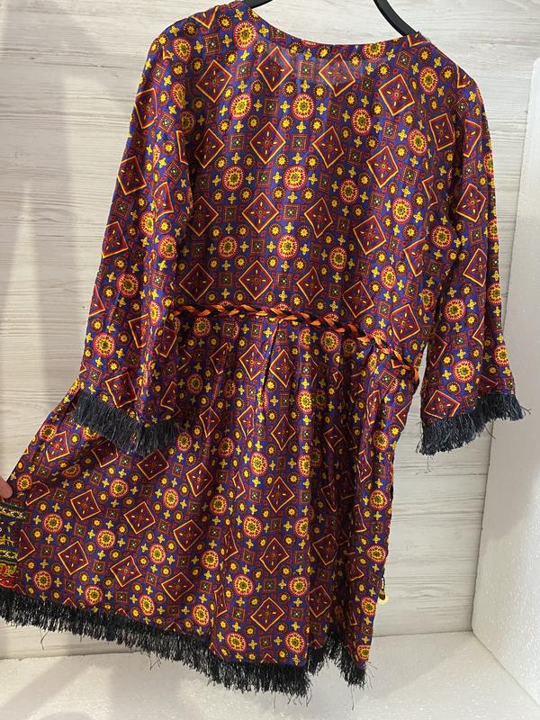 Платье свободного кроя,размер «М».Длина-85см,плечи-39см,рукав-47см,ширина от подмышки к подмышке полуобхват-50см,талия полуобхват-44см,бедра свободны,легкое,приятное на ощупь,100%вискоза.