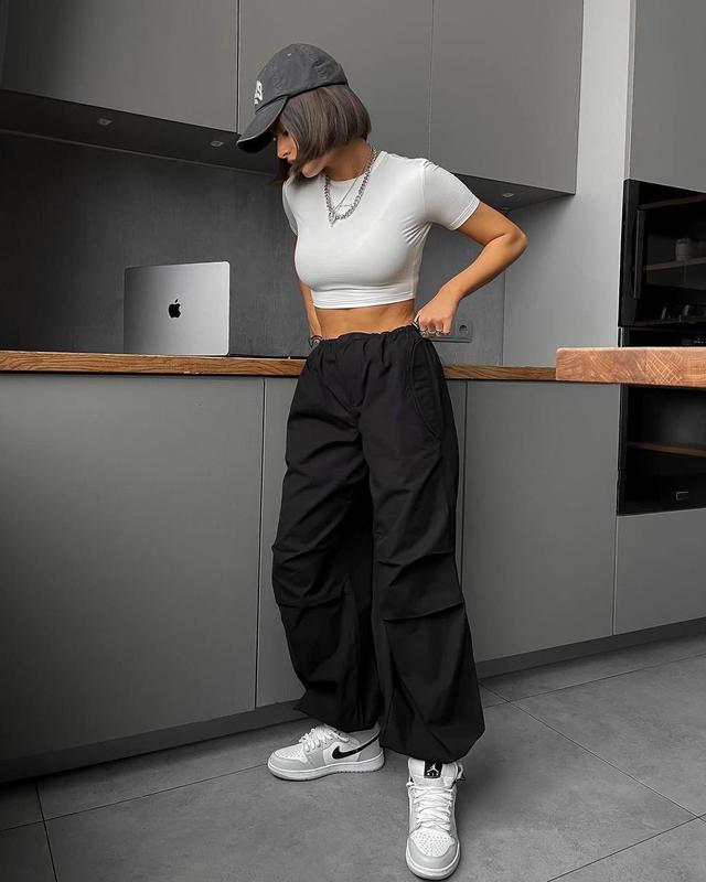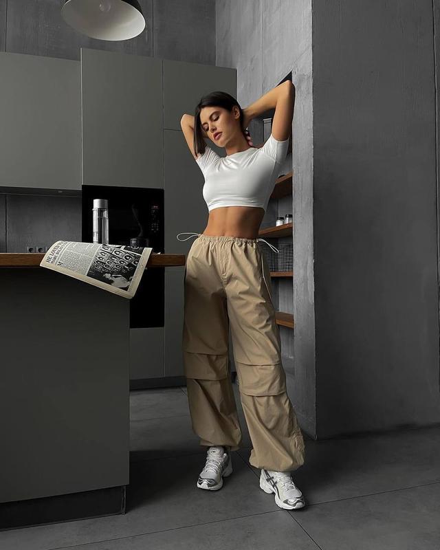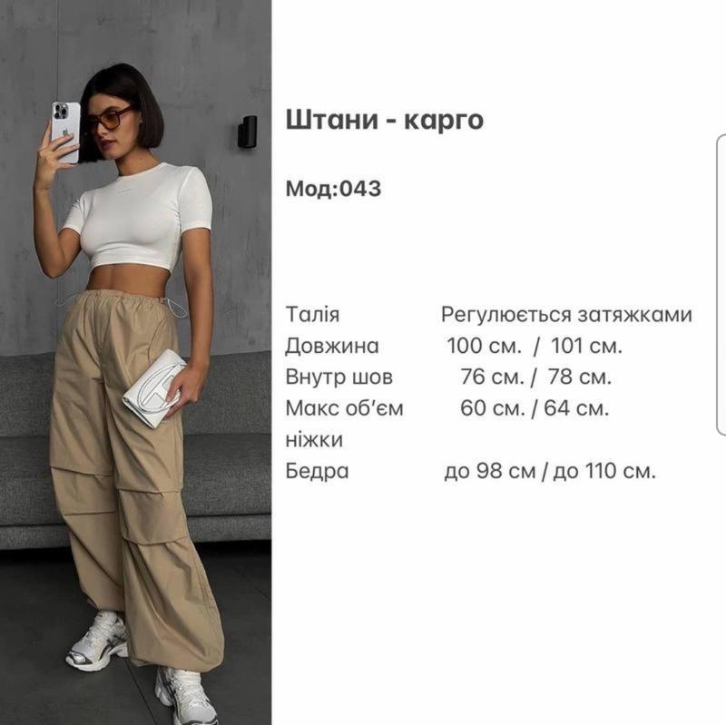 Широченные штаны карго – это признанный хит. Брюки идут с двумя функциональными карманами сзади и двумя карманами на кнопках по бокам. Прошивка в районе колен, как на фото. Талия на резиночках с затяжками, можно выбирать как носить: высокая или средняя посадка Мод: 043 Размеры: 42-44, 44-46 (замеры на последнем фото) Цвет: беж, черный Ткань: плащевка канада