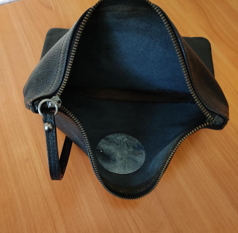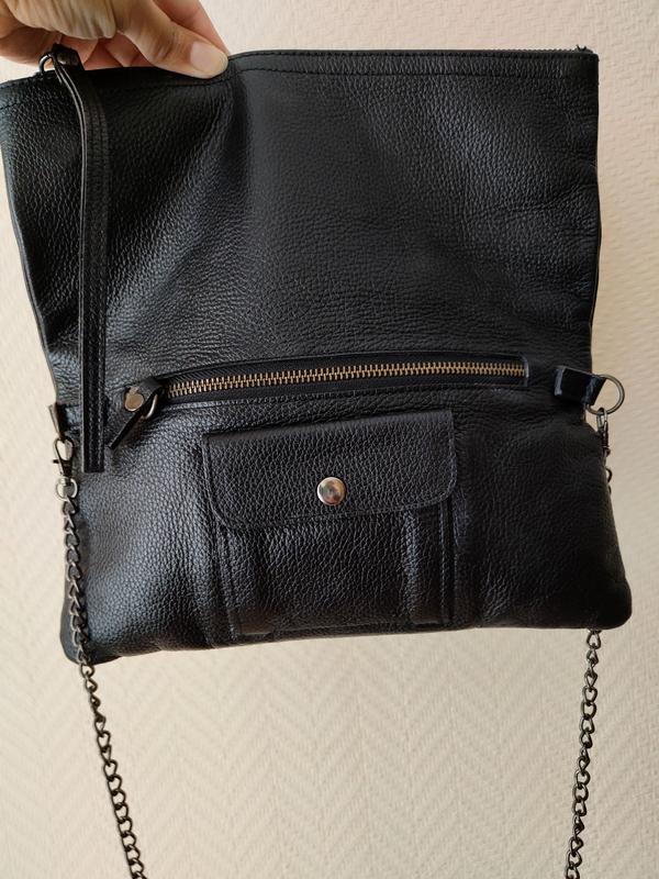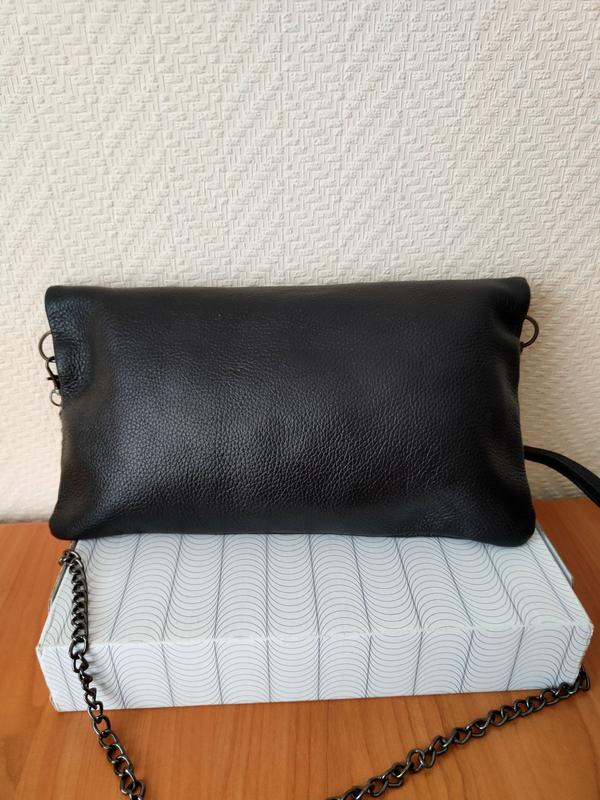 Черный кожаный клатч сумка Mulberry 29\\14 см, в полную высоту 29 см Основное отделение на молнии, внутри без подкладки. Есть карман на молнии и кармашек на кнопке. Выполнена из добротной натуральной зернистой кожи. Можно носить как клатч, или как сумку, есть длинная цепочка 118 см