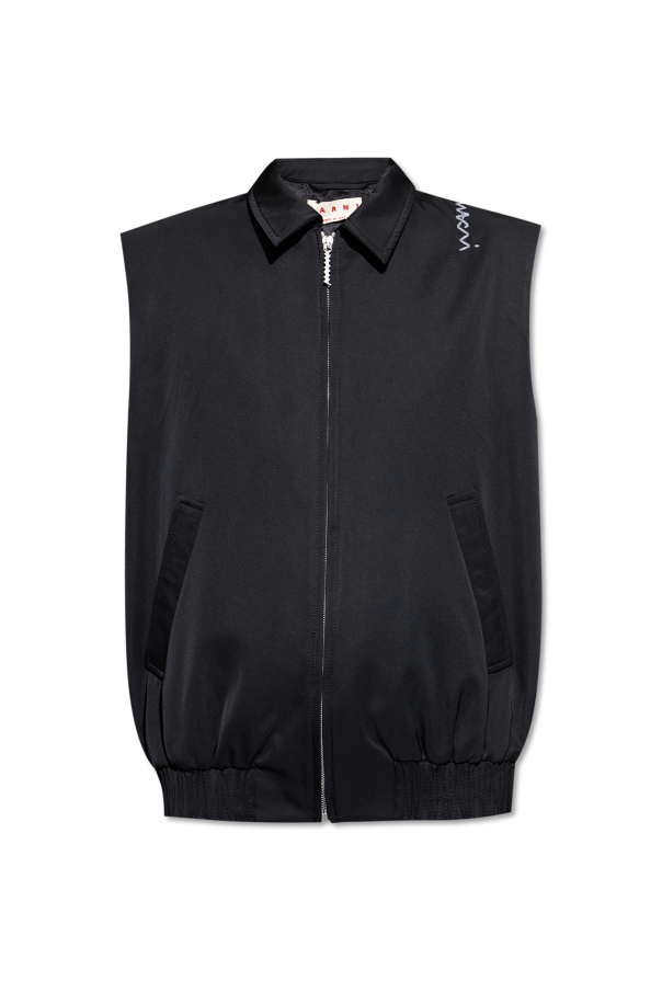 Introducing the Marni Logo Vest, a masterpiece from the exclusive fashion collection that epitomizes sophistication and modern elegance. Rendered in a timeless black hue, this vest boasts a classic, streamlined silhouette complemented by a refined collar. Crafted from a smooth blend of polyester and cotton, its exterior exudes a polished allure, while the inner viscose lining ensures comfort. The vest features a sleek zip closure and two side pockets for practicality. Adorned with the designer\'s logo on the shoulder, it radiates exclusivity and fashion-forward finesse. The elastic hem provides a perfect fit, adding a touch of contemporary flair to this exquisite piece. Why Choose This Product? Timeless black color with a classic, versatile design. Crafted from high-quality materials ensuring elegance and comfort. Features exclusive designer details with logo embellishment. Practical side pockets and a secure zip closure. Designed by the renowned Italian fashion house, Marni.