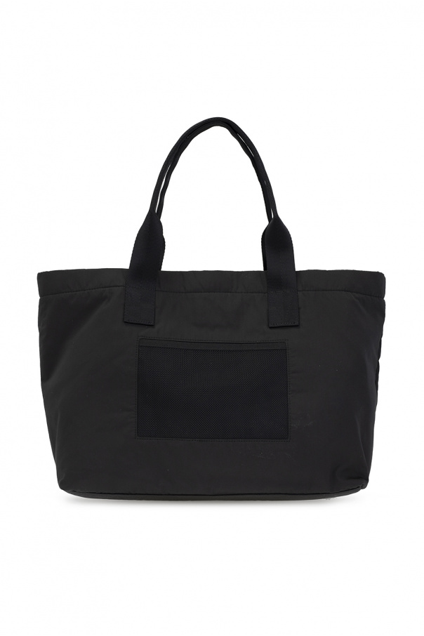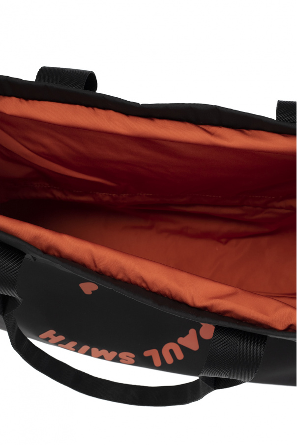 Black shopper bag from PS Paul Smith. Printed at front with the brand\'s logo in red, this design features a transparent slip pocket at the back, two half-round handles and one internal compartment.