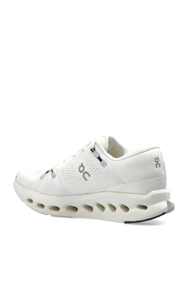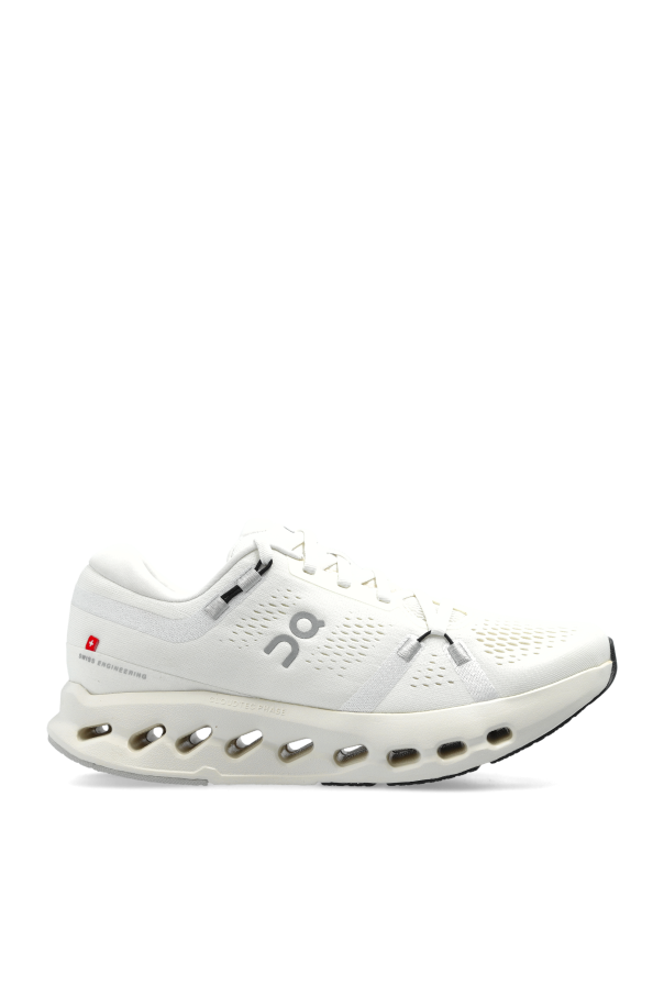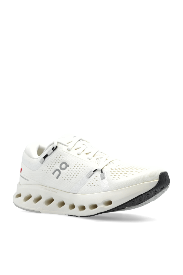 Introducing the Cloudsurfer 2, an exquisite pair of women\'s training shoes in a pristine white hue, designed by the illustrious On Running. Crafted with a breathable mesh upper, these shoes offer not only a striking appearance but also superior ventilation. The innovative design features a sole with distinctive openings, hinting at an advanced cushioning system that enhances comfort during every stride. Adorned with reflective elements, these shoes ensure visibility during low-light conditions, while the designer\'s logo graces the sides, adding a touch of sophistication. The lace-up closure ensures a tailored fit, complemented by ankle padding for added comfort. Ideal for urban running, the Cloudsurfer 2 is both modern and functional. Why Choose This Product? Designed in the Swiss Alps by On Running, a brand that revolutionizes running shoe technology. Features CloudTec® Phase cushioning for a smoother ride. Contains a Helion™ superfoam midsole for soft cushioning. Enhanced tongue construction for a better fit. Embroidered eyelets and overlays crafted from recycled yarn. Durable, computer-optimized outsole with improved tread pattern.