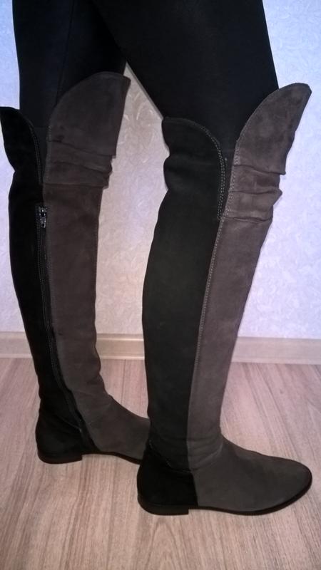 Сапоги из замши черного и серого цветов (двухцветный микс). Размер: 40 (26 см по стельке). Закруглений носок. Застежка: молния. Иногда очень сложно определиться, какими именно ботфортами нужно пополнить свой гардероб в модном сезоне. Выбор, как правило, необходимо сделать между натуральной гладкой кожей или замшей, черным и любым другим цветом. Дизайнеры Emanuele Gelmetti решили избавить женщин от выбора, и предложили модель KANDRA. Эта модель хоть и не сочетает в себе два вида материала, зато выполнена сразу в двух цветах – классическом черном и не менее классическом сером. Несмотря на такую цветовую нестандартность, фасон в модели очень лаконичный и отлично дополнит как наряды с брюками, так и наряды с юбкой или платьем. Ну а бикулорность модели упростит подбор таких аксессуаров как сумка, перчатки, шляпа и др. Невысокий каблук (2см.) застежка молния, закругленный носок - это параметры идеальной обуви, которая подойдет и молодой девушке и солидной даме. Материал: верх – натуральная замша; подкладка – утеплитель; подошва – резина.