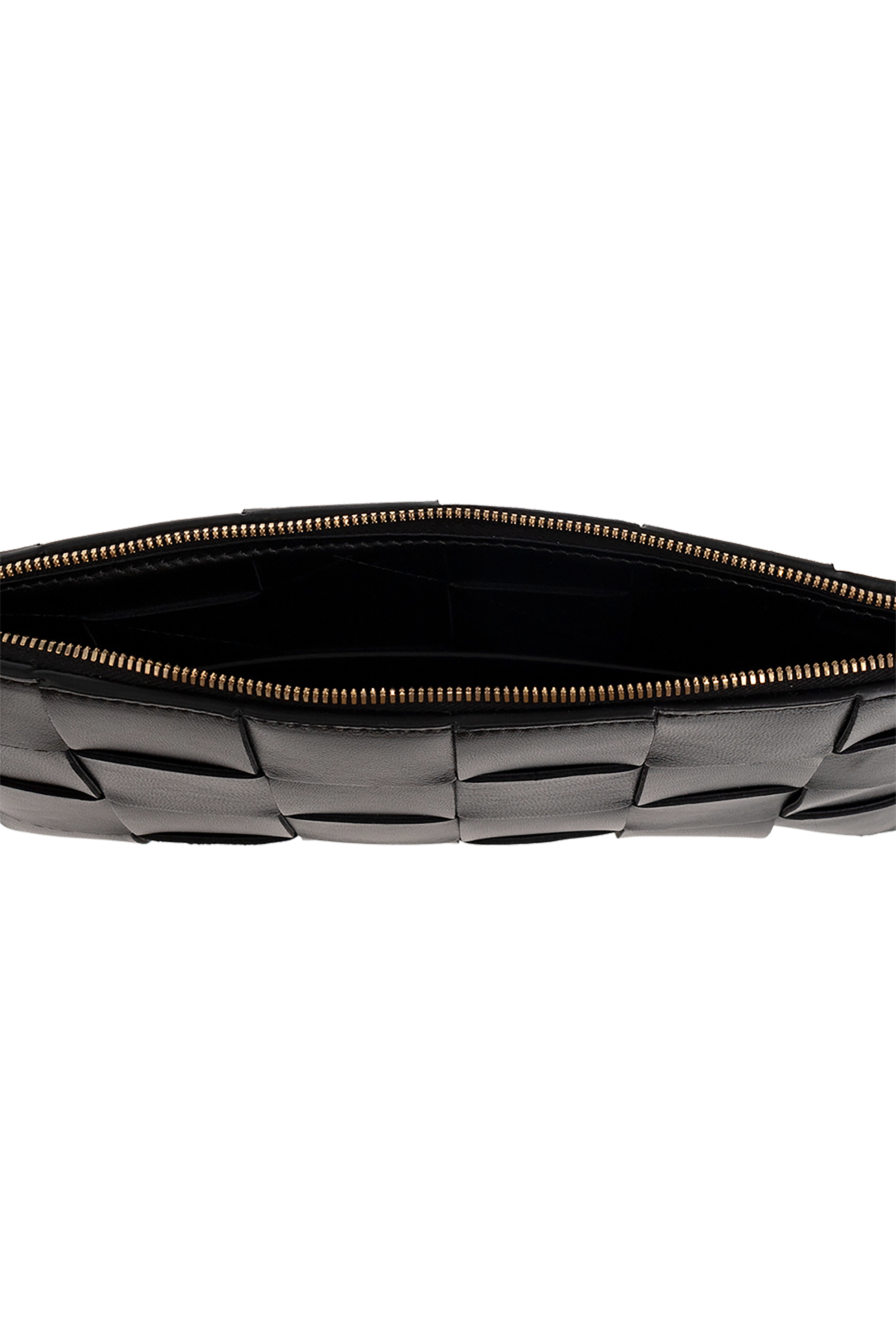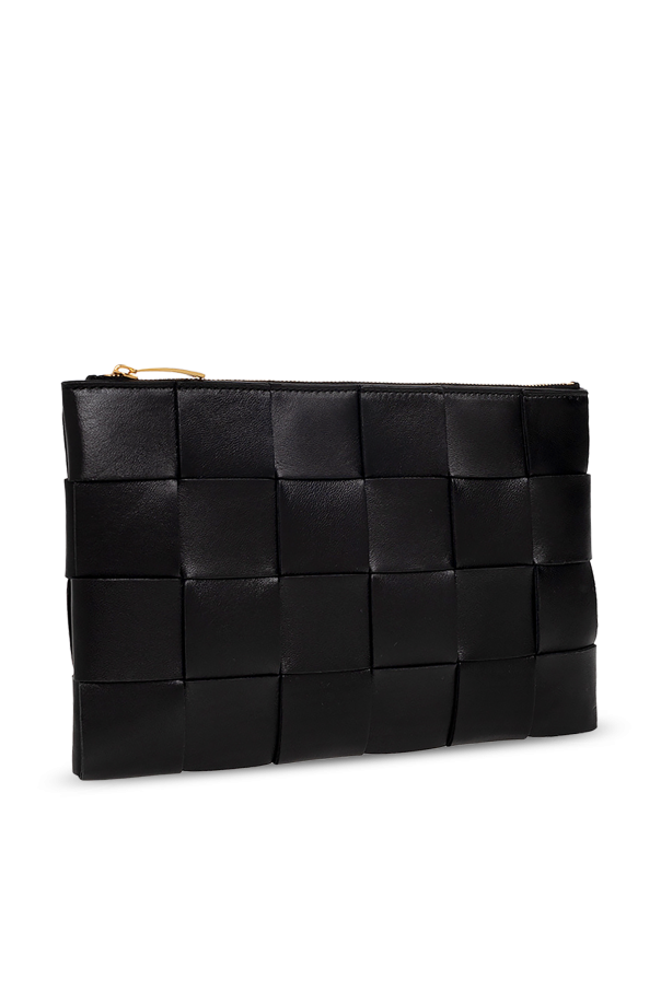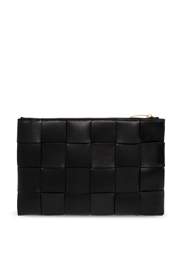 Black ‘Pouch Small’ clutch from Bottega Veneta. Made of lamb and calf leather, this model features a zip fastening, the iconic Intreccio weave, gold-tone metal hardware and one internal compartment with one slip pocket.
