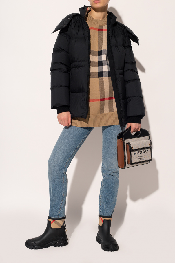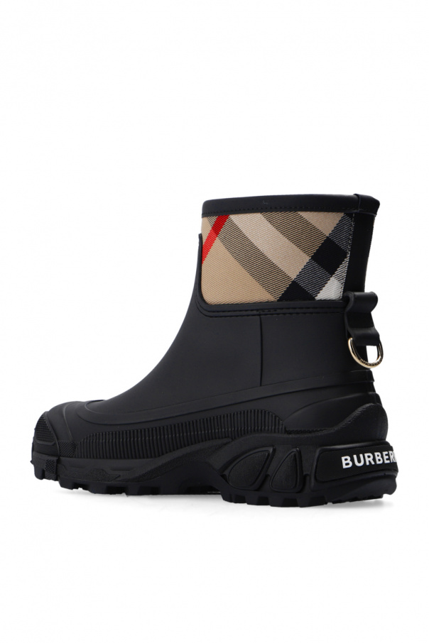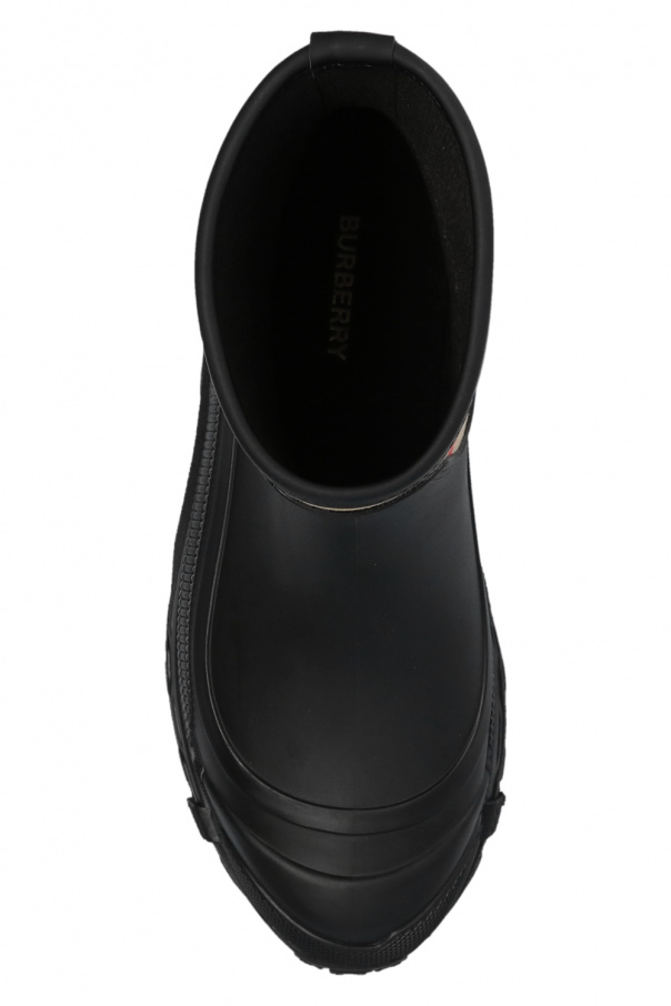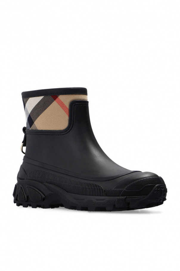 Black rain boots from Burberry. Enriched by an insert with the label's iconic check pattern, this model features tactile white logo lettering on the back and a black rubber sole at the base.
