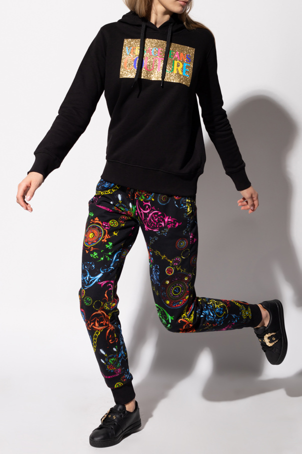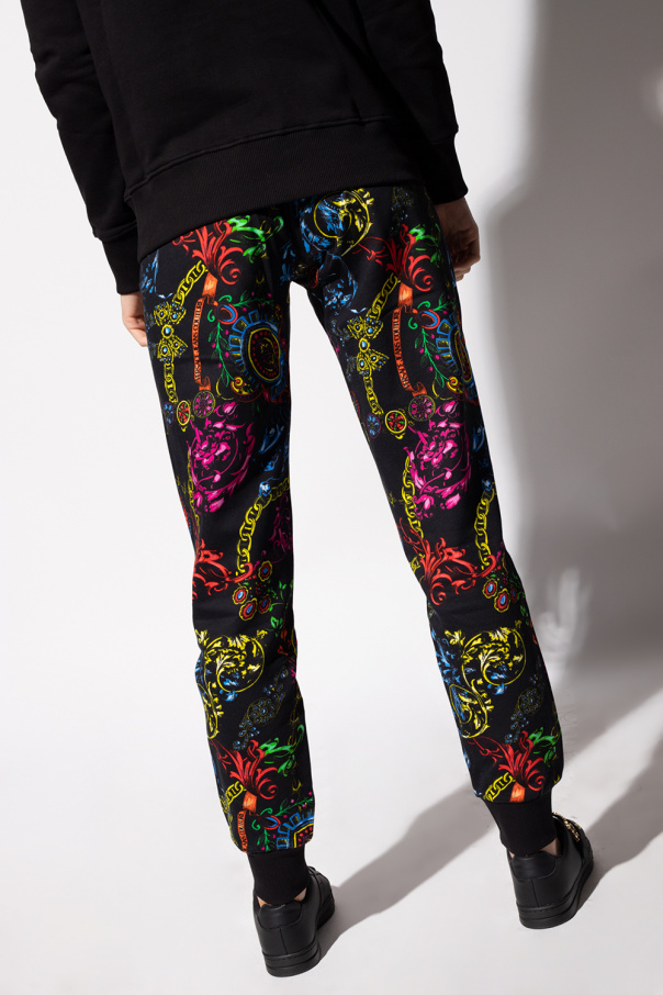 Black sweatpants from Versace Jeans Couture. Crafted from cotton, this pair showcases a colourful graphic print with the brand\'s logo and the iconic Barocco motif. It is complete with a drawstring waist, two front zipped pockets and elasticated cuffs.