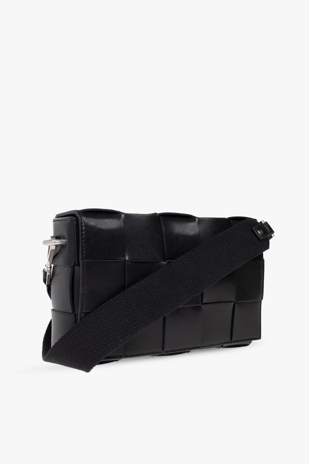 Black ‘Cassette Medium’ shoulder bag from Bottega Veneta. Crafted from lamb leather, this design secures with a magnetic fastener and showcases the brand\'s signature Intreccio weave, a detachable and adjustable shoulder strap with a removable zip pouch, silver-tone metal hardware and one internal compartment with a zip pocket.