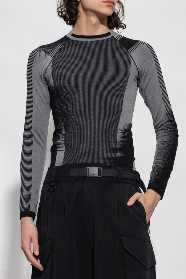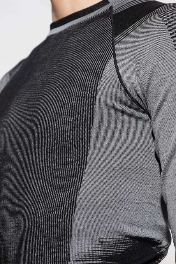 Black and grey training T-shirt from Y-3 Yohji Yamamoto. Crafted with a form-fitting silhouette, this style features an embroidered logo at the back, raglan long sleeves and elasticized trim on the round neck and cuffs.