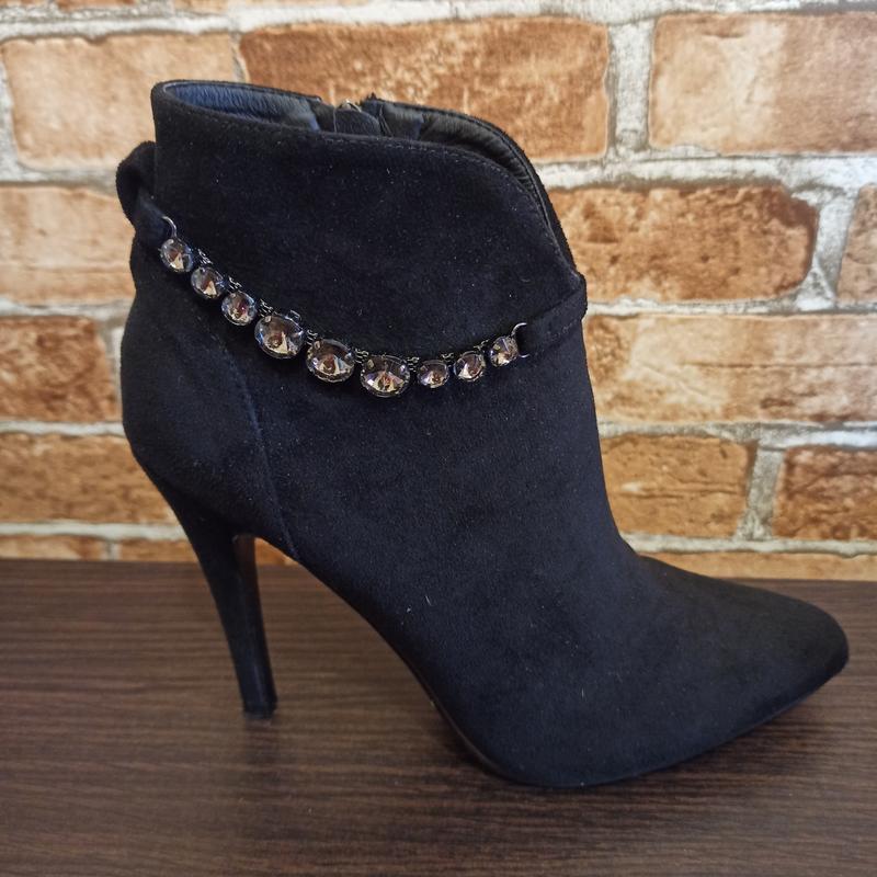 Женские ботильоны на каблуке, подойдут на размер 37,5, 38, на узенькую или средней полноты ножки. Штучна замша. Украшение по желанию можно снять. Высота каблука - 10 см.