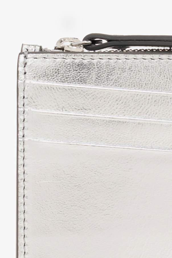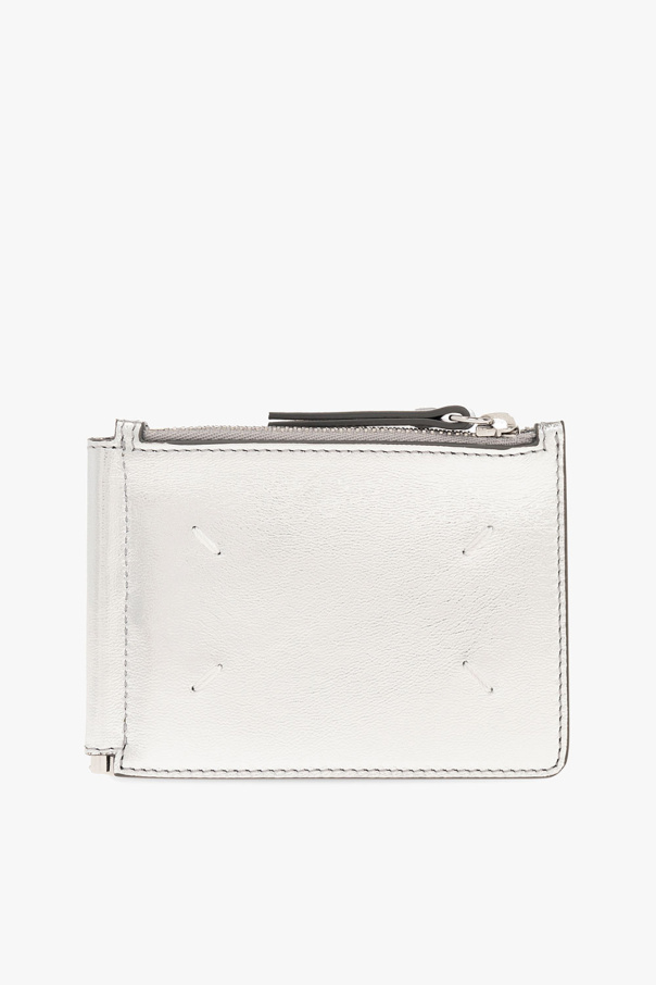 Silver-tone bifold wallet from Maison Margiela. Made of leather, this item features a white logo embroidery, zipped coin pocket, three card slots at the back and money clip.