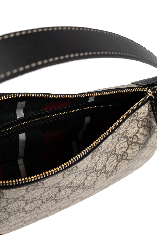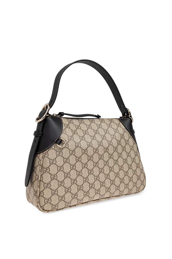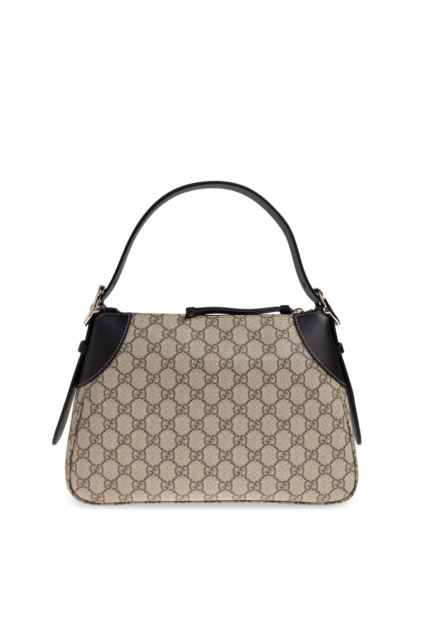 Introducing the GG Emblem Medium Shoulder Bag by Gucci, a testament to timeless elegance and unparalleled craftsmanship. This rectangular masterpiece, adorned with the iconic GG monogram, is crafted from fine textile fabric with exquisite calfskin leather details. The harmonious blend of beige with striking black accents on its handles and corners exudes sophistication. The bag is designed with a short handle for shoulder carrying, accentuated by opulent gold-toned hardware that enhances its luxurious appeal. A secure zip closure ensures your essentials are safely stored, while the interior reveals a striped lining in vibrant red, green, and white hues, complete with a practical zip pocket. Why choose this product? Iconic design with the signature GG monogram High-quality materials: textile, calfskin leather, and metal Elegant gold-toned hardware for a sophisticated touch Practical interior with a zip pocket Exquisite craftsmanship by Gucci, a leader in luxury fashion