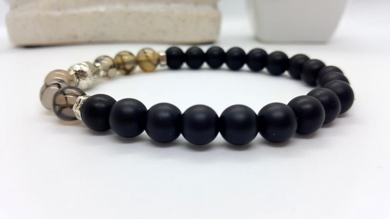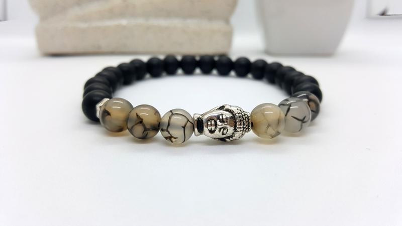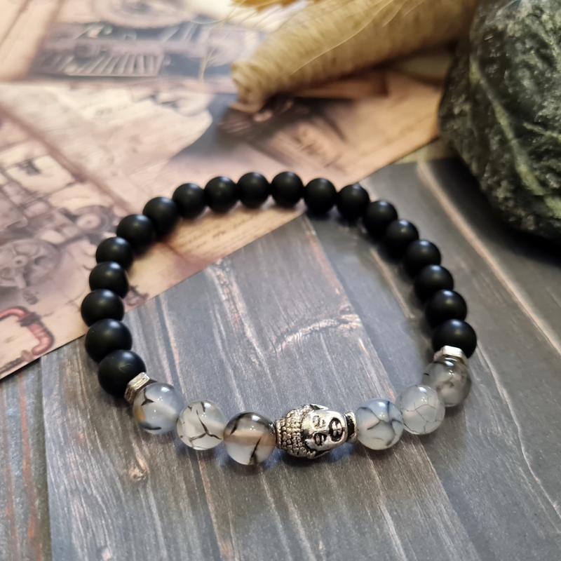 🐲🔥 Мужской браслет резинка "Будда" с бусинами из натуральных камней - матовый шунгит и агат "вены дракона" в светло-серых оттенках с черными прожилками.. Фурнитура серебристого цвета. Смотрите видео-обзор (вверху страницы) этого браслета, чтобы увидеть всю его красоту.🐲🔥 Размер: Размер бусин 8мм, браслет на размер руки от 19 см до 21 см Состав: бижутерный сплав, натуральный камень шунгит, агат вены дракона.