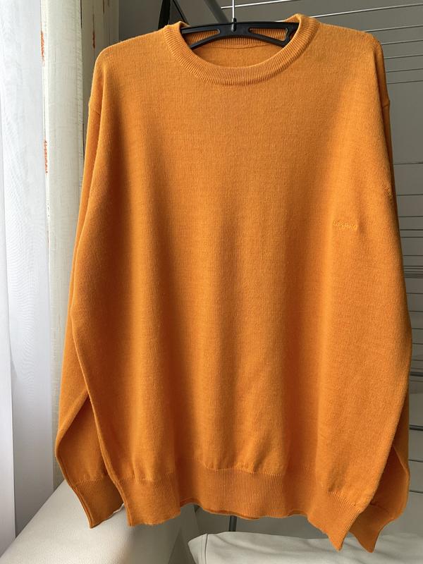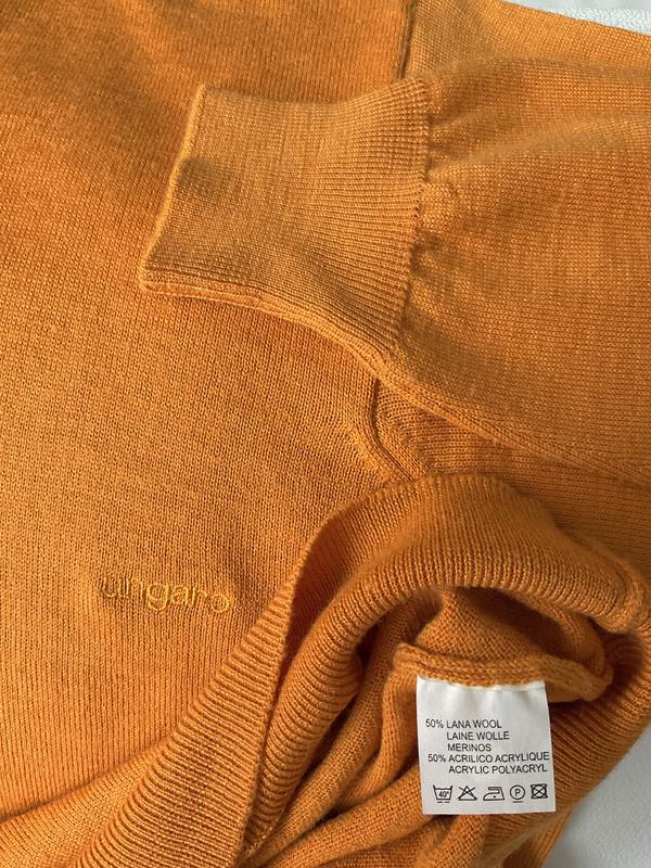 Солнечный джемпер от фр. бренда Emanuel Ungaro. Тонкий смесовый трикотаж из шерсти мериноса высшего качества, вышивка бренда, новое состояние, без бумажного ценника и воротниковой бирки. Укахан XL размер, 50% шерсть, 50% акрил. Поб плечи-46см., Поб грудь-60см., Поб талии-57см., Поб по нижнему краю-41см., Длина по спине от ворота-68см., от плеча-66см., Длина рукава-62см.