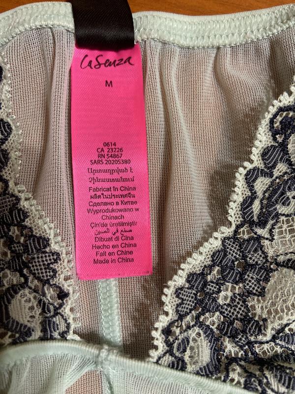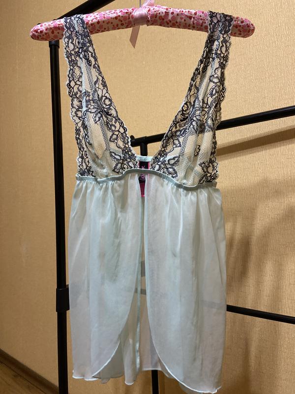 Нежный пеньюар из сетки, с кружевным лифом и открытой спинкой, бренд La Senza, размер М. Свет салатовый цвет, кружево: салатово- черное бретельки- регулируются. Полу обхват под грудью в состоянии покоя-30 см, длина изделия-61 см. Материал: полиамид, вискоза, эластан