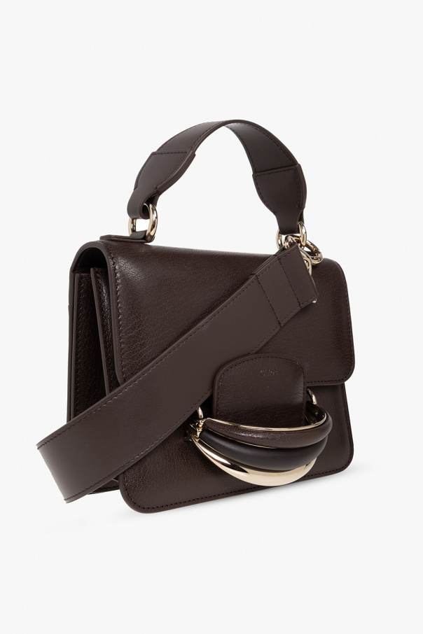 Dark brown ‘Kattie Small’ shoulder bag from Chloé. Crafted from goat leather, this model fastens with a logo-embossed snap and is complete with a decorative triangle handle in leather, metal and wood, back pocket, half-round handle, detachable and adjustable shoulder strap, light gold-tone metal hardware and one internal compartment with one slip pocket and one card slot.