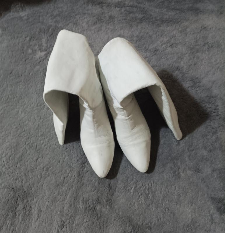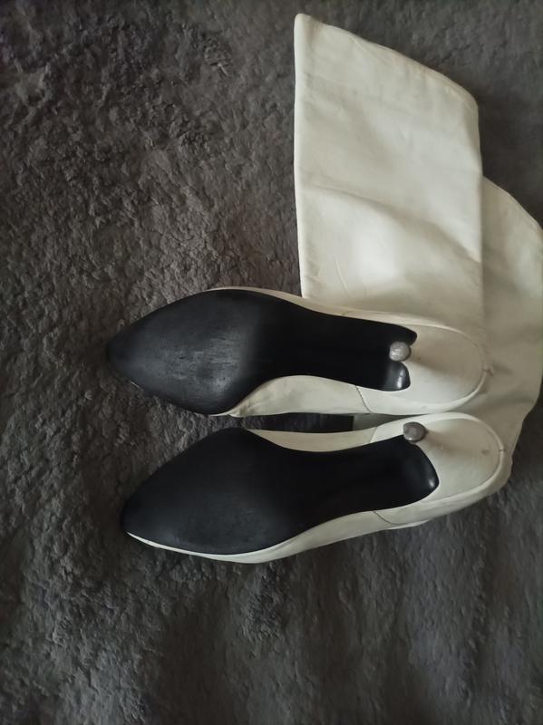 Шикарні і м'які, стильні і зручні, високі, білі чоботи з натуральної шкіри, на підборі середньої висоти - 8 см. Устілка- 22,5 см. Висота чобітка (спереду) - 45 см, ззаду - 42 см.