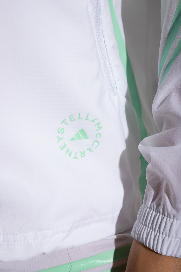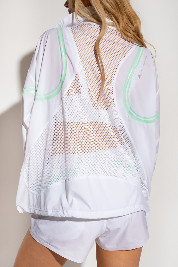 White track jacket from ADIDAS by Stella McCartney, the ‘End Plastic Waste’ line. Crafted from recycled material with a relaxed silhouette, this style features a zip fastening, a high-neck collar, back mesh inserts, light green logo applications, figure-enhancing elements, two zip pockets, a drawcord-adjustable hem and long sleeves with elasticated cuffs.