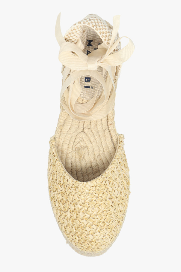 Beige and cream ‘Valenciana’ shoes from Manebi. Made in raffia, this model features a tie ankle and a woven jute sole with a beige natural rubber trim at the base.