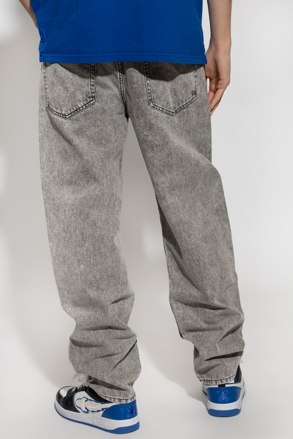 Grey ‘Larson’ tapered jeans from MARANT. Fastened with a zip and button, this pair features a brown logo-embossed patch, five slip pockets and tapered legs with a vintage effect.