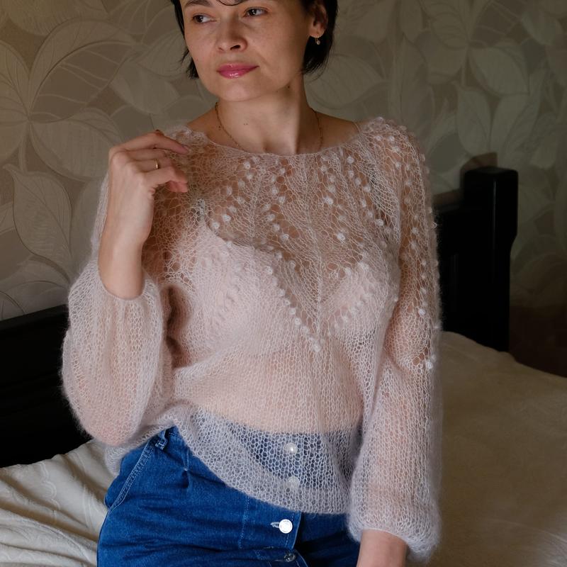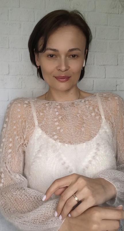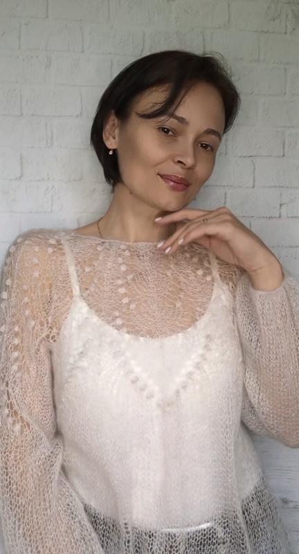 Ажурна павутинка ручної роботи з пряжі люкс супер кід мохер на натуральному шовку. Павутинка светрик не колеться, м'який і лагідний навіть для чутливої шкіри. Виготовлення під замовлення у будь-якому кольорі і розмірі. Більше відео в інстаграм **********за назвою магазину розмір M не велика L якщо потрібна консультація пишіть💙💛