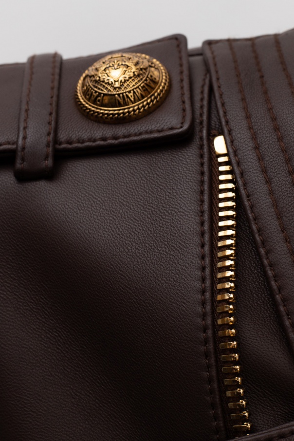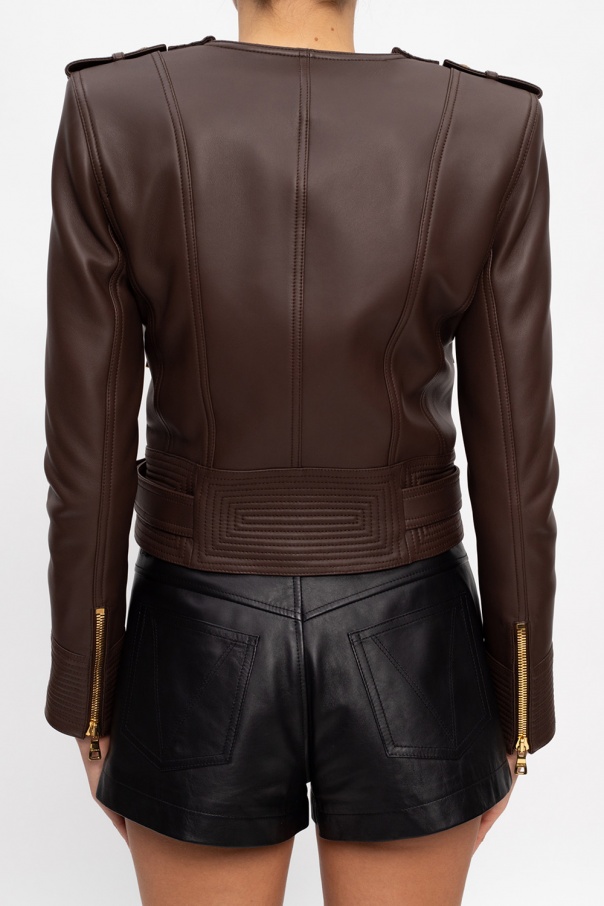 Brown biker jacket from Balmain. Crafted from lamb leather, this garment fastens via zip and showcases two zipped pockets, gold-tone metal fittings and zipped vents to the cuffs. Exposed stitching details and gold-tone logo appliqués complete the look.