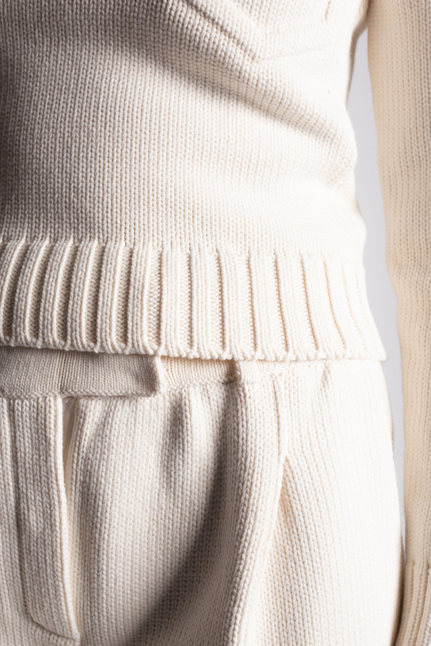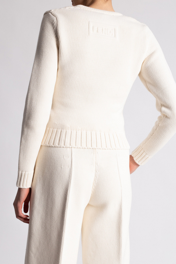 Cream knit sweater from Fendi. This V-neck design features long sleeves and a raised logo at the back.