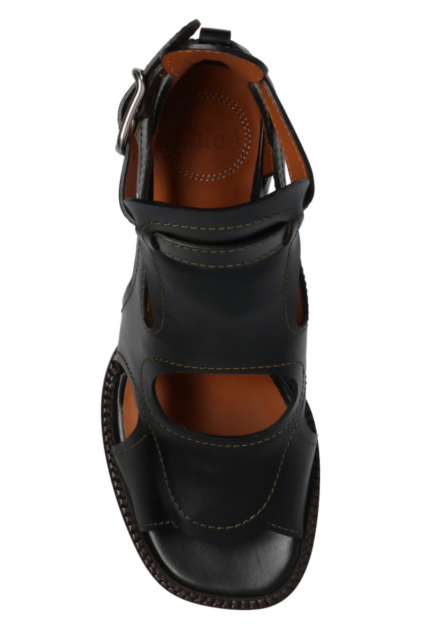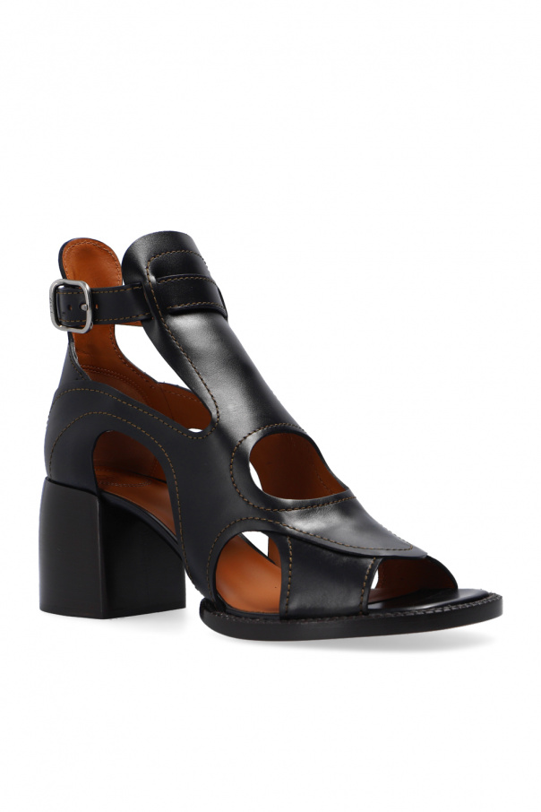 Black ‘Gaile’ pumps from Chloé. Made of leather, this pair sits on a light brown leather sole and boasts an open-toe silhouette with decorative stitching details, cut-outs and a strap with a silver-tone buckle wielding an embossed logo.