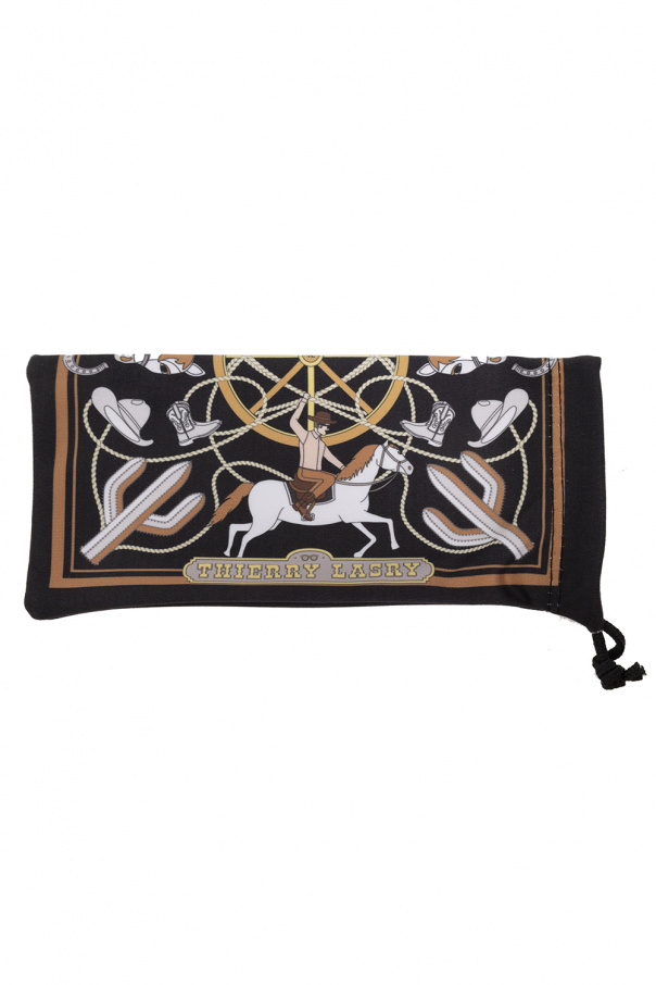 Black ‘Darksidy’ sunglasses from Thierry Lasry. Handcrafted in Italy from authentic Italian acetate, this pair has rectangular frames and blue glass lenses with 100% UV protection. Comes with a case.
