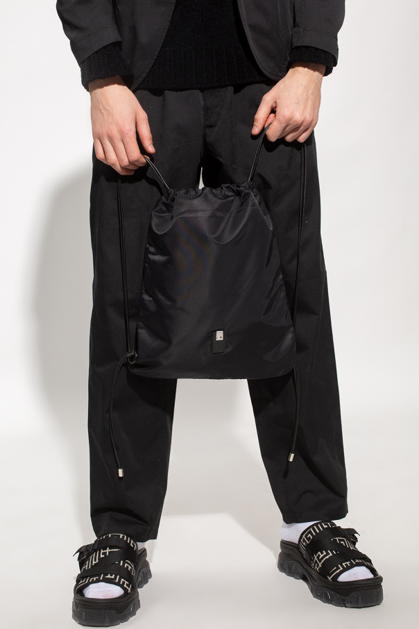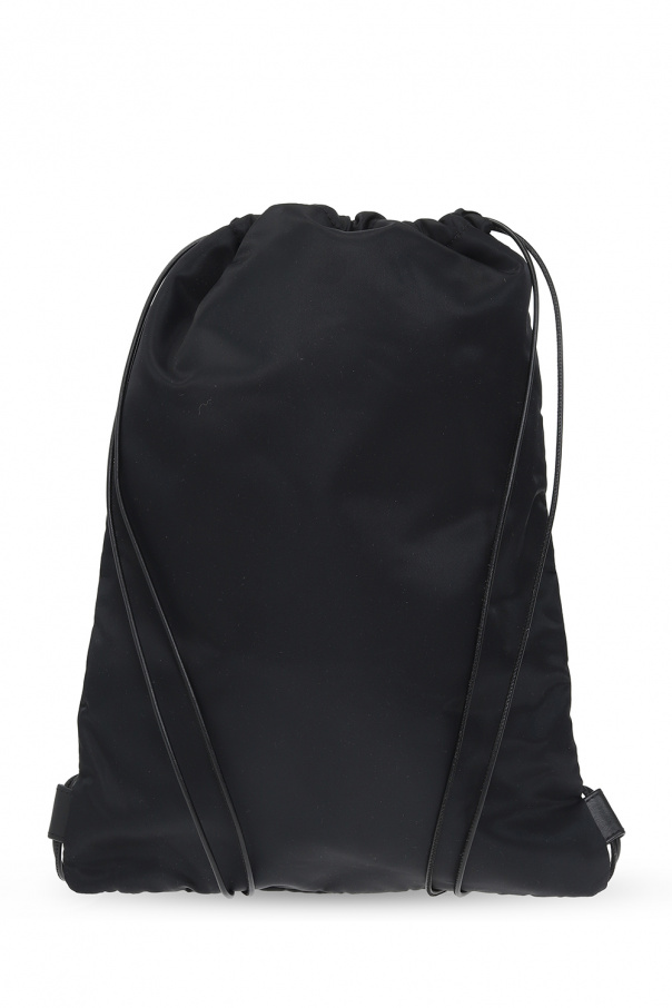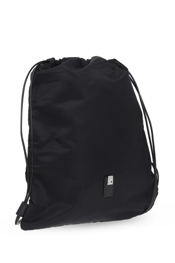 Black drawstring backpack from 1017 ALYX 9SM. Accentuated with a metal logo patch on the front, this design features silver-tone metal hardware and one internal compartment with a zipped pocket.