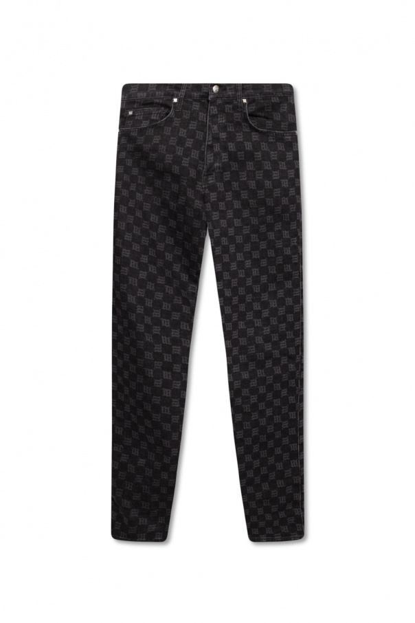 Black and grey ‘Monogram’ denim shorts from MISBHV. Made of cotton, this pair has slightly tapered legs, button fastenings, ‘M’ monogram pattern, five slip pockets and beige logo patch at the back.
