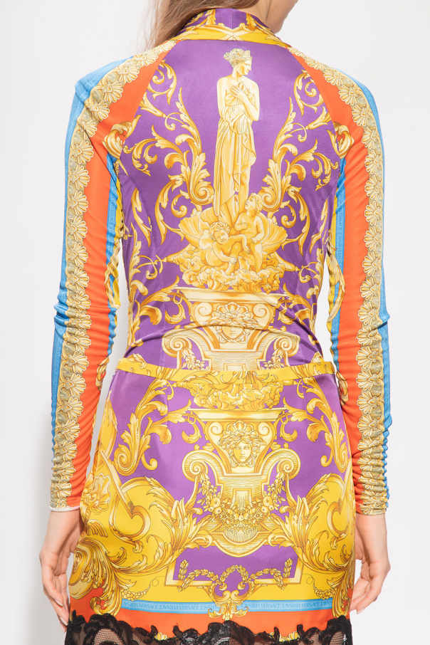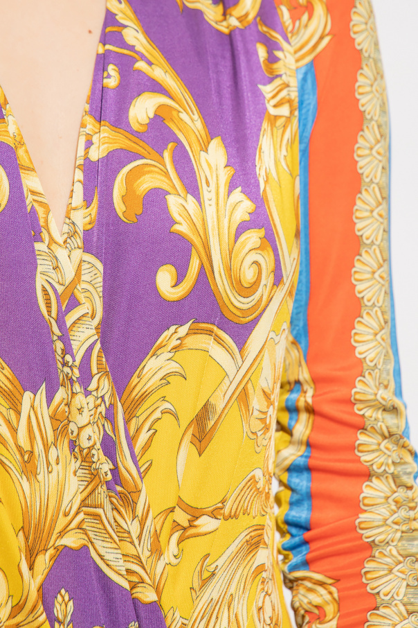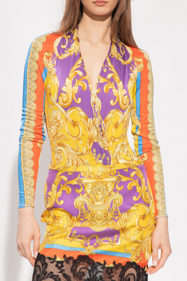 Multicoloured bodysuit from Versace. Boasting the brand's Barocco Goddess print, this style features a draped, plunging V-neckline, long sleeves and hook closures at the crotch.