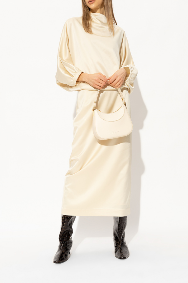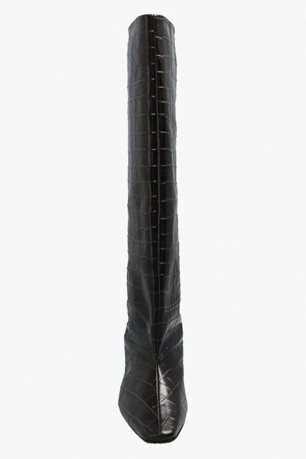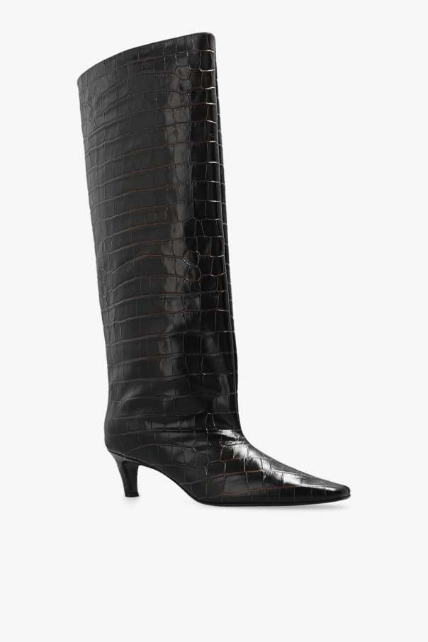Brown ‘Shaft’ heeled boots from Toteme. Crafted from leather with a crocodile skin effect, this model features a slip-on silhouette, a wide below-the-knee upper, a slim toe and a black leather sole.