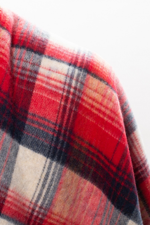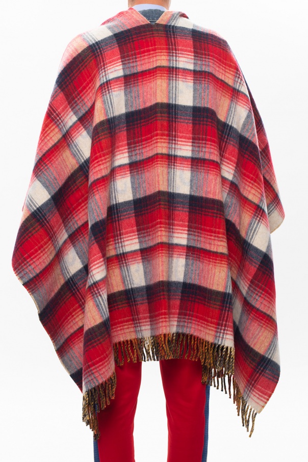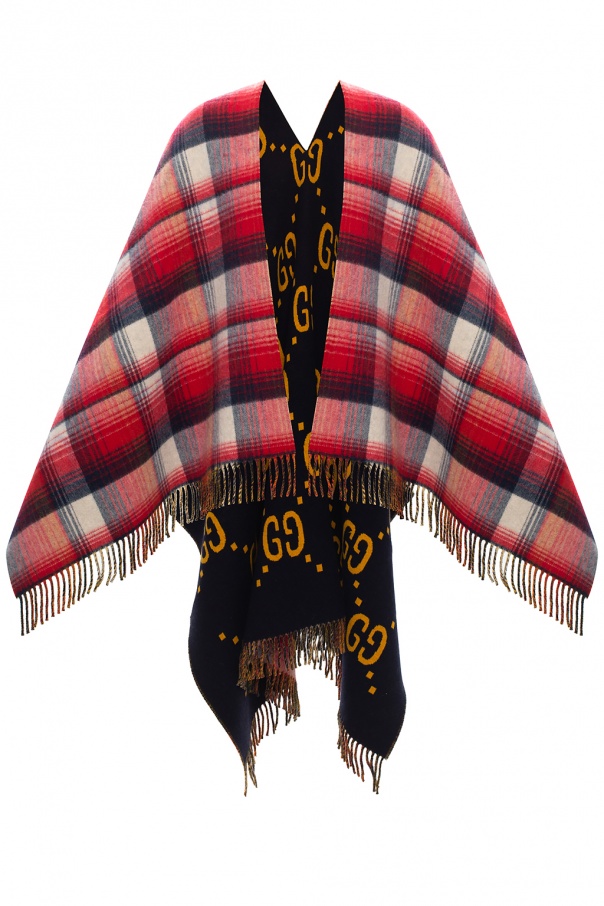 Red, white and black poncho from Gucci. Crafted from wool in two ways, this item changes from check pattern on one side to yellow GG pattern embroidery on the reverse. Its also features fringed borders.