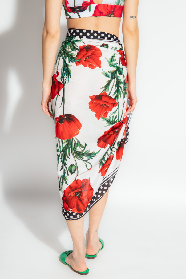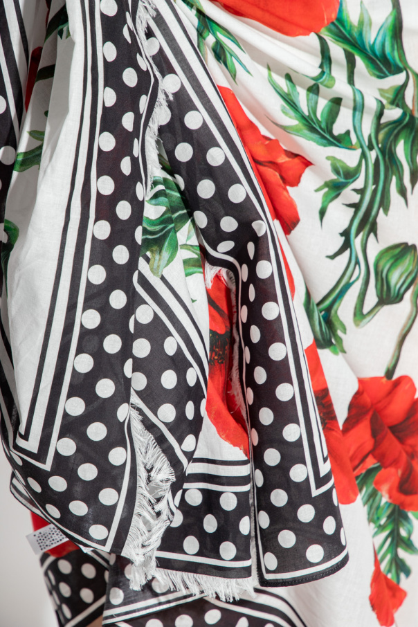 White and black pareo from Dolce & Gabbana. Made of cotton, this design is enriched by a polka dot pattern, red, green and black floral motif, logo detail and fringes.
