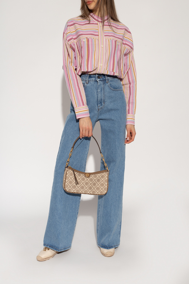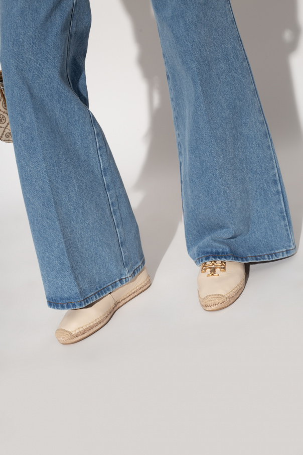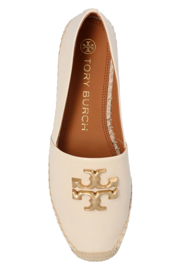 Light beige ‘Eleonor’ espadrilles from Tory Burch. Made of leather, this pair features a metal logo appliqué in gold-tone and a beige rubber sole.