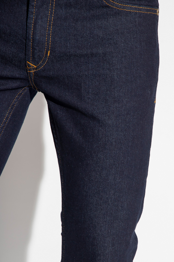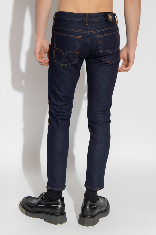 Navy skinny fit jeans from Versace Jeans Couture. Fastened with a button and zip, this tapered leg pair features logo patches and five slip pockets.