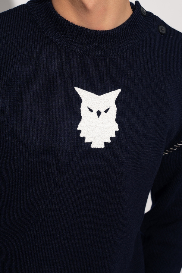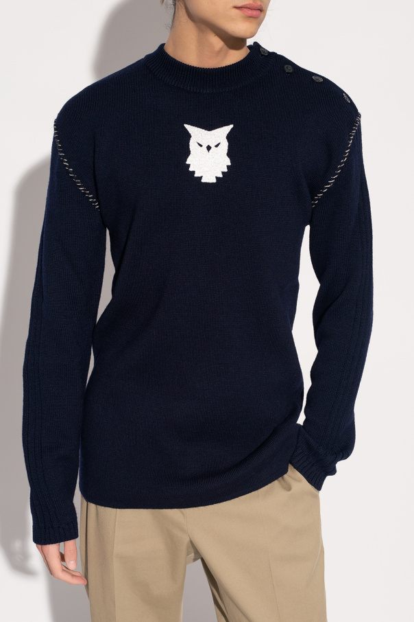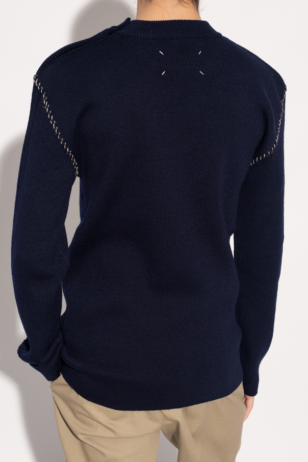Navy blue crewneck sweater from Maison Margiela. Made of wool, this style features button fastenings on the shoulder, white graphic embroidery on the front, brown and cream stitching details and long sleeves.