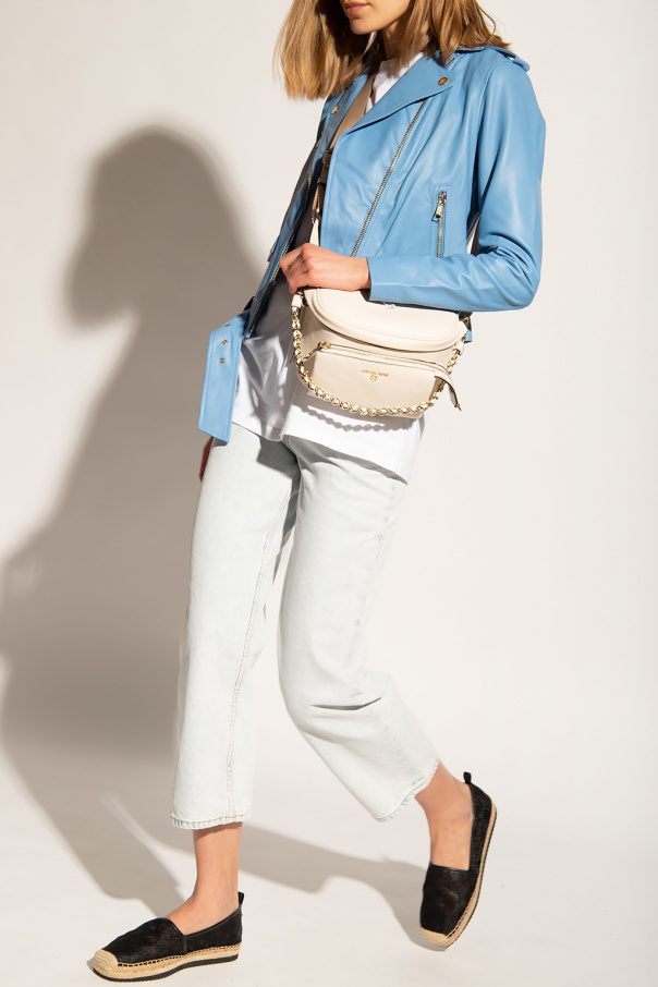 Blue biker jacket from Michael Michael Kors. Made of lamb leather, this garment features a zip fastening, adjustable buckle belt, three slip pockets, one snap-fastened pocket and zips at the cuffs.