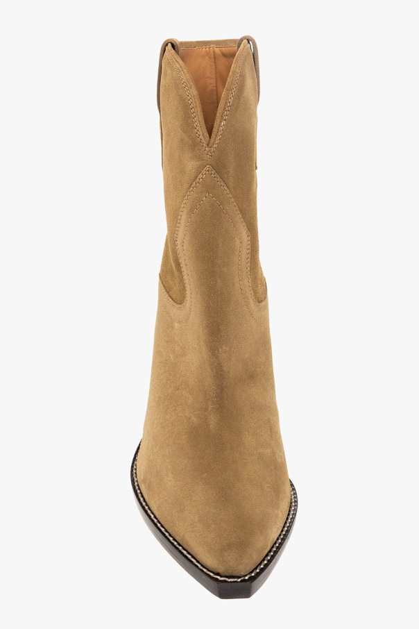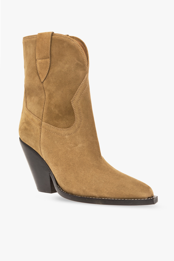 Khaki ‘Leyane’ heeled ankle boots from Isabel Marant. Crafted from suede, this slip-on pair features an almond toe, block heel and beige leather sole.