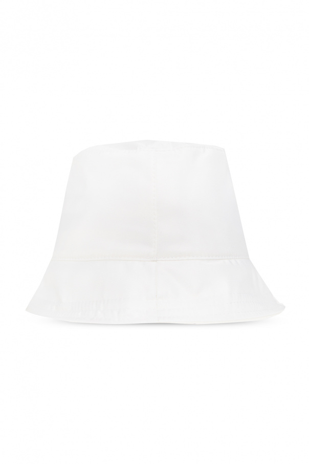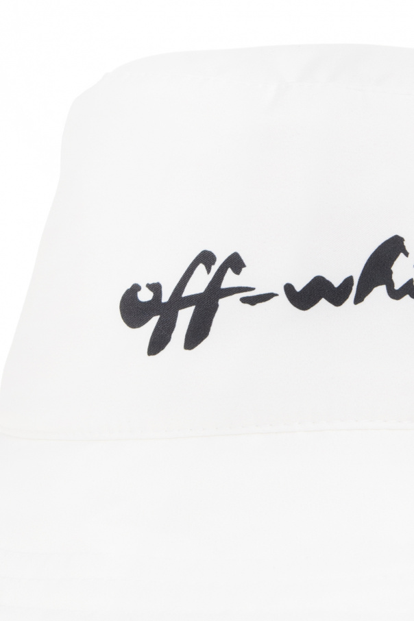 White bucket hat from Off-White. This item showcases a black logo pattern for brand recognition.