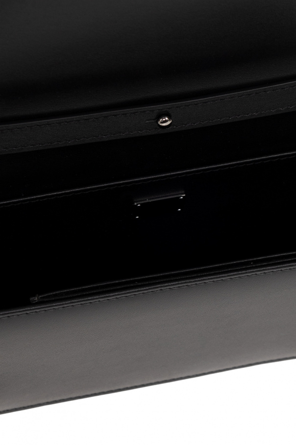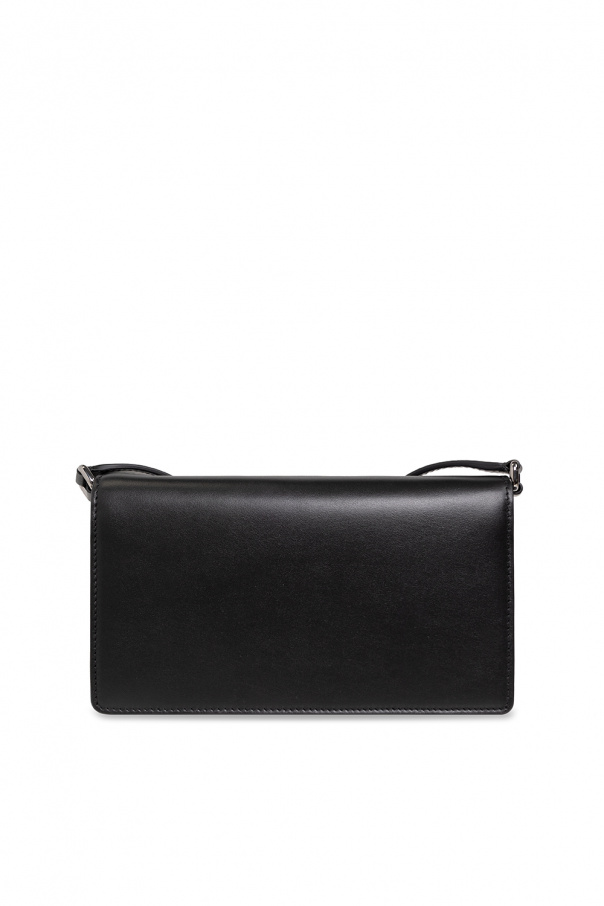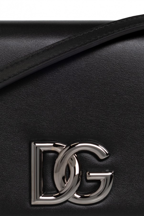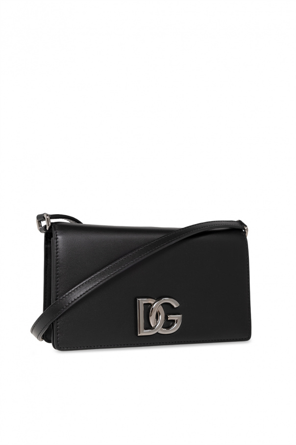 Black phone holder from Dolce & Gabbana. Crafted from calf leather, this design secures with magnetic snaps and showcases a flap with gold-tone DG hardware, a detachable and adjustable shoulder strap, silver-tone metal elements and one internal compartment with two slip pockets and an extra card case including three card slots.