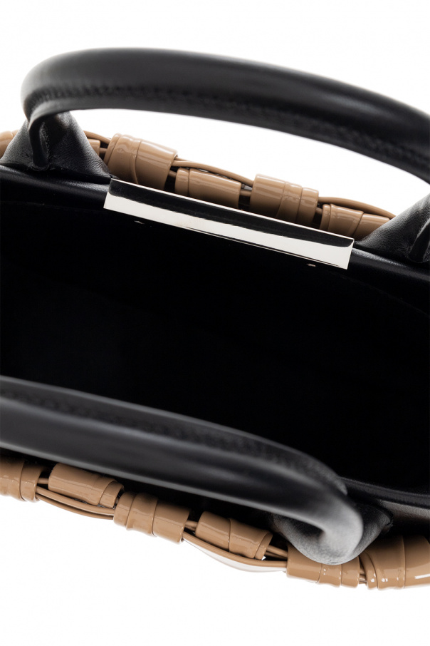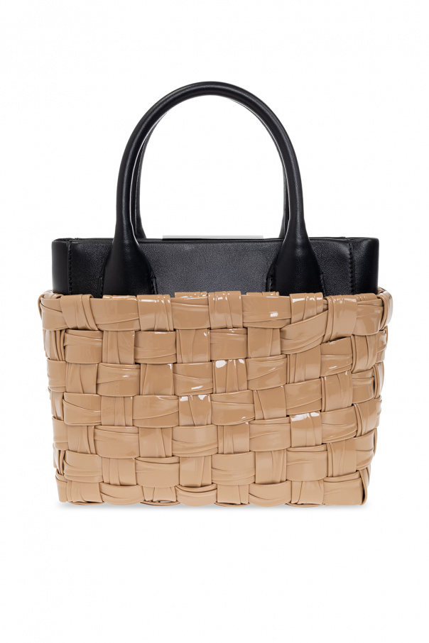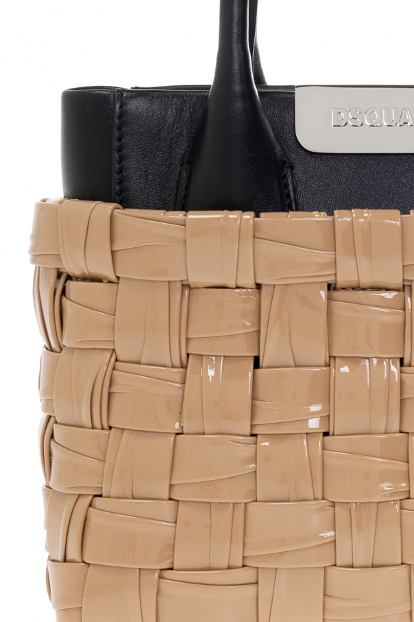 Beige and black ‘Mama Wave’ handbag from Dsquared2. Made in part of leather, this model features decorative woven coated faux leather, metal logo-embossed appliqué in silver-tone, two half-round handles and one internal compartment.