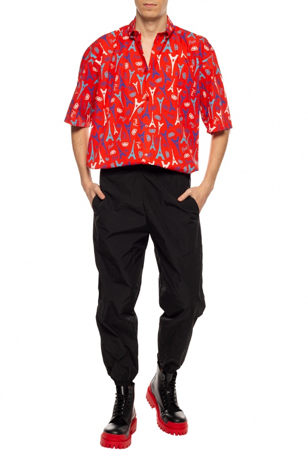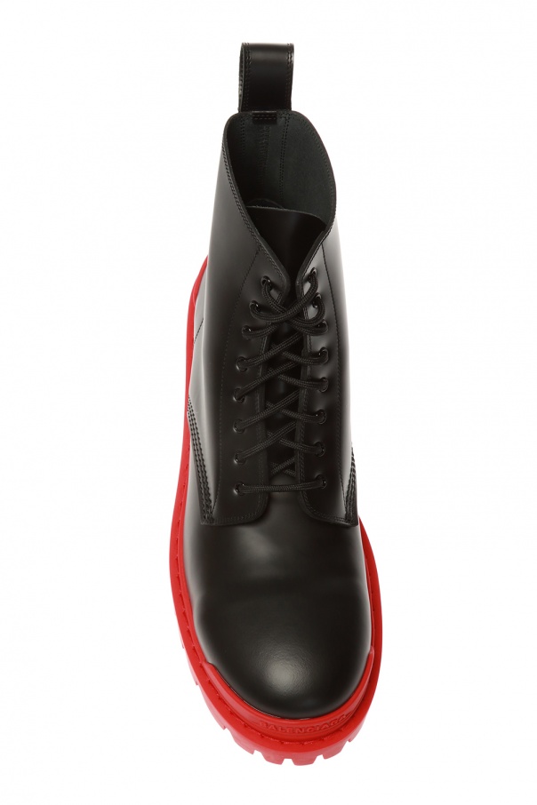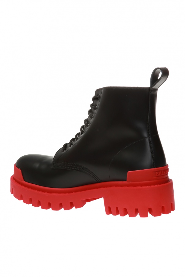 Black ‘Strike’ lace-up platform boots from Balenciaga. Made of leather. Red rubber sole.