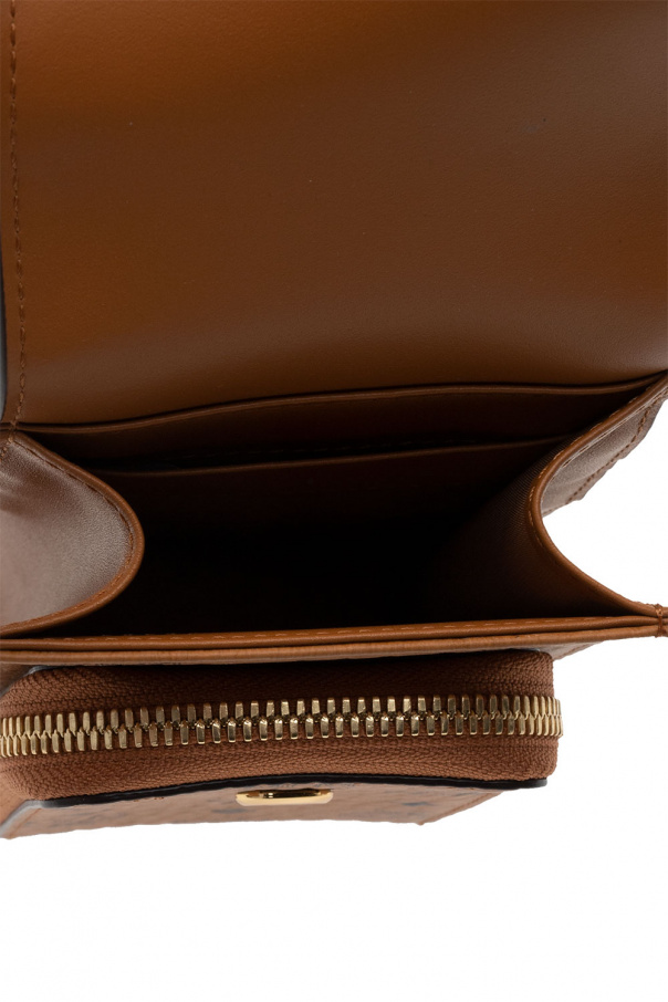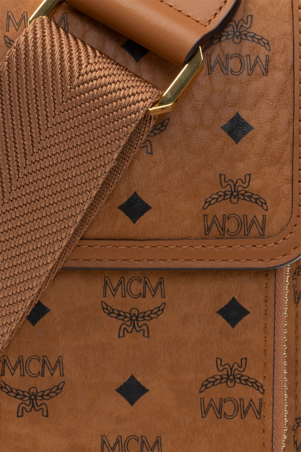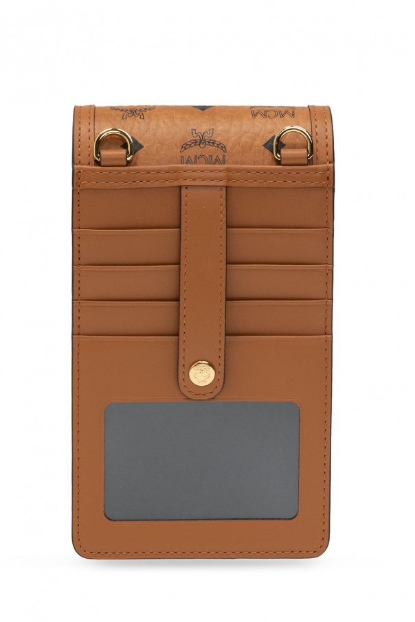Brown smartphone case from MCM. Enriched with a black monogram pattern, this item fastens via a snap-button and employs an external zip pocket on the front, four card slots on the back, an adjustable strap, gold-tone metal hardware and interior with one compartment and one slip pocket.