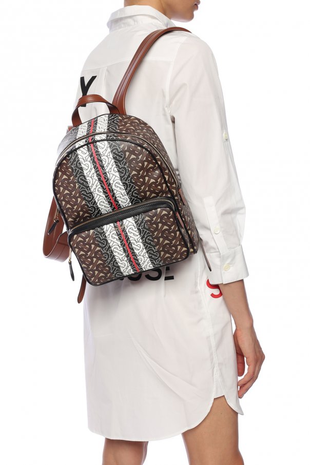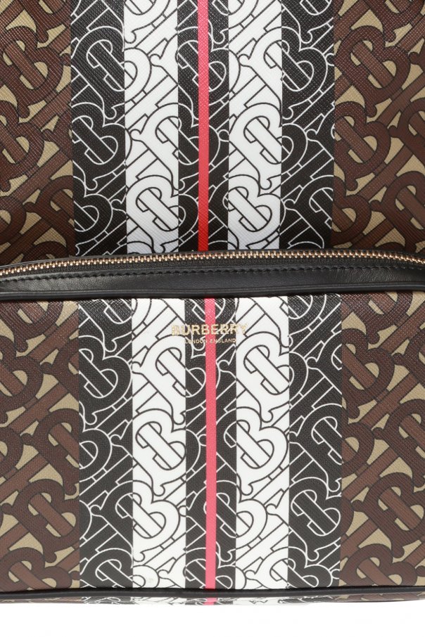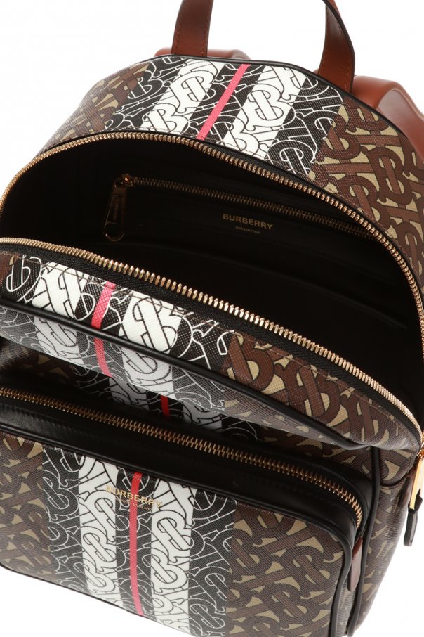 Brown, black and white ‘TB’ backpack from Burberry. Fastened with zip. Finished with black leather. Embellished with printed colourful pattern. It features gold-tone metal hardware, a half-round handle, adjustable shoulder strap and interior with 1 compartment, 1 zip pocket and 1 slip pocket inside.