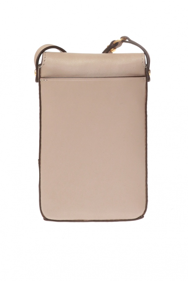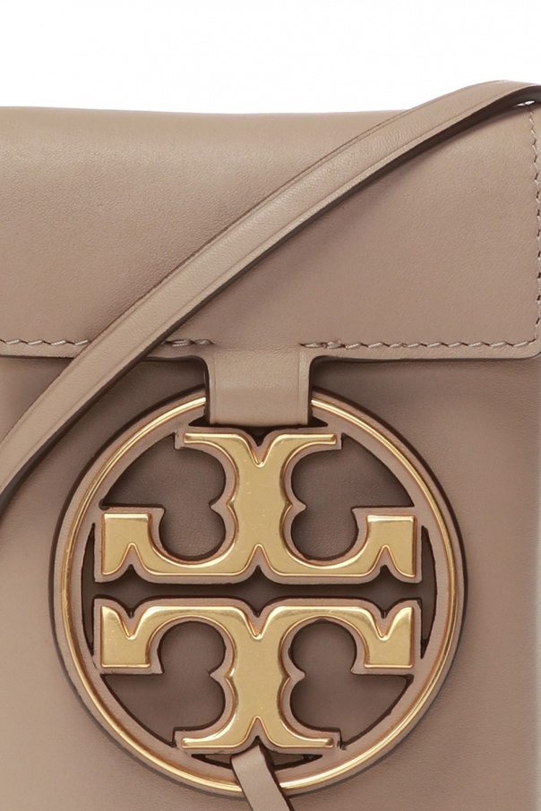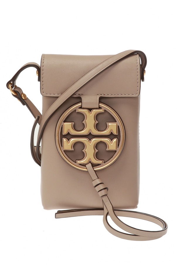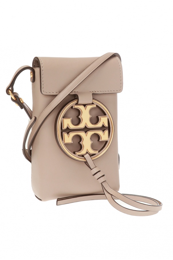 Beige ‘Miller’ phone case from Tory Burch. Made of leather. Magnetic closure. Decorated with a metal logo in gold-tone. Adjustable shoulder strap. One compartment and 2 card slots inside.