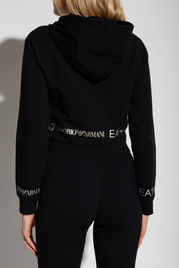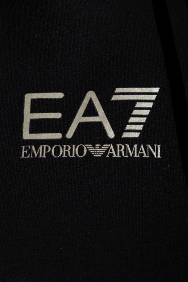 Black sweatshirt with a drawcord-adjustable hood from EA7 Emporio Armani. Crafted from cotton jersey, this style features reflective logo prints on the front and back and elasticized trims on the bottom hem and cuffs.